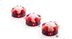 Сливочное масло 82%, сливки 35%, молоко, греческий йогурт, сыр Филадельфия, мягкий козий сыр, яйца, соль, сахар, сахарная пудра, инвертированный сахар, глюкоза, слабая мука, миндальная мука, белый шоколад 35%, нейтральное растительное масло, вафельная крошка, листовой или порошковый желатин, лиофилизированный порошок лесных ягод, криспи малины, разрыхлитель, Yopol, альбумин, пектин NH, лимонная кислота, белый краситель (диоксид титана), фиолетовый водорастворимый краситель, розовый водорастворимый краситель, пюре инжира, пюре запеченной свеклы, пюре малины, свежий или замороженный инжир.