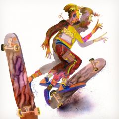 Для примера мы возьмем скейтбординг. Скейтеры двигаются с большой скоростью, движения их трудно зафиксировать. В качестве учебного референса мы возьмем короткое видео, внимательно его посмотрим, сделаем первые быстрые зарисовки. Поговорим о том, как научится замечать и запоминать сложные движения. Затем выберем наиболее удачный скетч, увеличим его и с помощью смешанных материалов завершим рисунок.