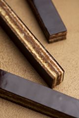 Опера состоит из идеально ровных слоёв миндального бисквита, пропитанного кофейным сиропом, ганаша с чёрным шоколадом, масляного кофейного крема и шоколадной глазури.