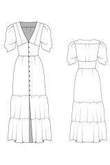 Платье прилегающего силуэта, длиной до середины голени, для пошива из тонких шелковых/вискозных материалов. Лиф с фигурной талиевой кокеткой, со складкой по центру переда и центру спинки (вместо складки может быть сформирована сборка). Спинка с плечевой кокеткой. Юбка прямая с вытачками, с двумя ярусами со сборкой. На основе этой юбки может быть смоделирована любая другая. Рукав объемный, сложной формы со складками, длиной до локтя. В комплекте лекал (отдельным файлом) есть классический одношовный рукав для самостоятельного моделирования. Застежка платья центральная на 12 воздушных петель/пуговиц (д.7-8мм).