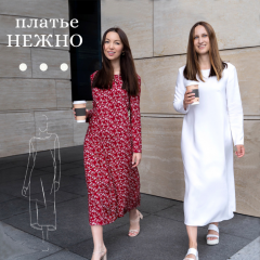Платье полуприлегающего силуэта, расширенное к низу. Перед с наклонными «французскими» нагрудными вытачками из бокового шва. Спинка цельнокроеная со сборкой на талии эластичной тесьмой в скрытой кулиске. Горловина спинки с разрезом. Рукав втачной длиной до запястья. Выкройка представлена в 2х вариантах длин – миди и мини.В комплекте выкройки