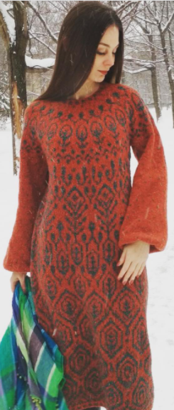 Платье вяжется по кругу снизу вверх до подрезов, затем рукава набираются на бросовую нить и кокетка вяжется по кругу вверх. После этого петли рукава снимаются с бросовой нити и вяжутся вниз на желаемую длину