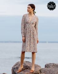 Выкройка платья. Платье прилегающего силуэта длиной до колена, отрезное по талии. На переде сборка по плечевому шву и под грудью в области втачного фигурного пояса. Юбка конической формы, со сборкой по талии. Вырез горловины глубокий V-образный. Рукав покроя полуреглан, длиной до запястья, с двумя защипами по низу, на притачной манжете. Застежка-молния в среднем шве спинки.