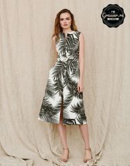 Выкройка платья. Платье прилегающего силуэта, отрезное по линии талии, длиной ниже колена. Платье спереди и сзади имеет по две талиевые вытачки. Лиф спинки имеет средний шов. В боковых швах присутствуют карманы. Застежка центральная встык, на навесные петли и пуговицы, с нижней планкой. Края борта вверху имеет фигурную линию. Модель укомплектована съемным поясам, застегивающимся на пряжку.