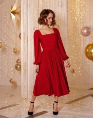 Платье приталенное, отрезное по линии талии, длиной ниже колена, на подкладке. Лиф платья с U-образным вырезом (разновидность выреза «каре»). Перед лифа с рельефами, выходящим из выреза горловины до талии. Спинка лифа с рельефами, выходящими из проймы до талии, в среднем шве обработана застежка на потайную тесьму «молния». Юбка «солнце» (2 боковых шва, средний шов заднего полотнища) со сборкой по линии талии. В модели представлены 2 варианта рукава: