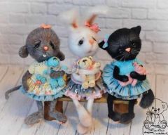 Малышки ростом 19 см, без учета ушек, все детали ввязаны, пришиваются только ушки и веки, полностью на проволочном каркасе, в попе стеклянный гранулят, носики и зубки мышки вылеплены из пластики. Кофточка для платья связана, юбочка сшита вручную.