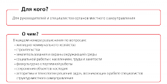 В статьях рассматривается успешный опыт работы муниципальных образований и управ, как Москвы, так и регионов России. Опытные эксперты предлагают алгоритмы и технологии решения задач, возникающих в работе специалистов структур местного самоуправления. Наших подписчиков всегда ждут индивидуальные условия и привлекательная стоимость!