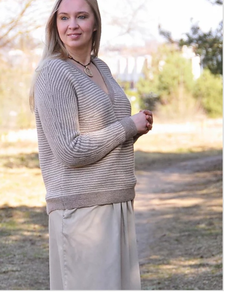 Пряжа: стоковая пряжа Pinori Filati Alpaca, 60% альпака 20% шерсть, 20% акрилан, 370 м в 100 гр., около 190 (200, 210, 220, 235, 250, 265) гр. серо-коричневого цвета (далее – нить А), и около 140 (150, 155, 165, 175, 185, 195) гр. бежевого цвета (далее – нить Б). Для пуловера понадобится всего 1220 (1295, 1350, 1425, 1515, 1610, 1700) м, из них 700 (740, 775, 815, 870, 925, 980) м нити А и 520 (555, 575, 610, 645, 685, 720) м нити Б.