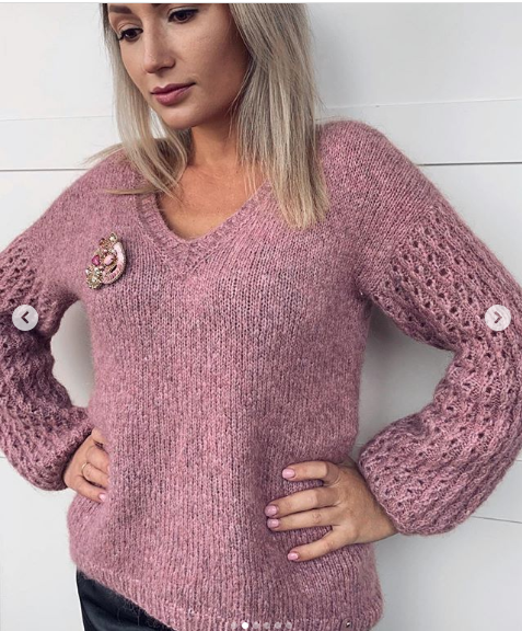 пуловер свободного прямого силуэта со спущенным плечом и ажурными рукавами
