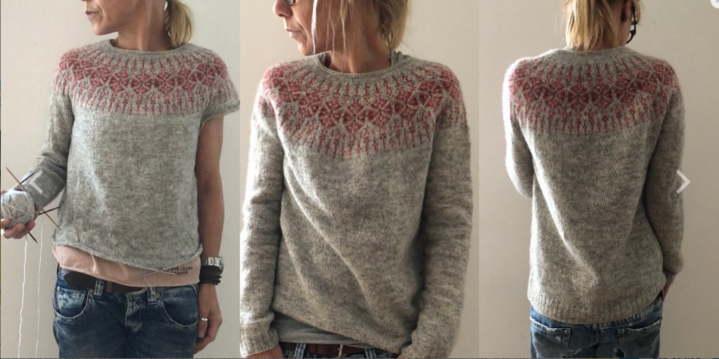 Бесшовный пуловер от Изабель Кремер, вязаный спицами с необычным жаккардовым узором на кокетке.