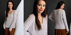 Пуловер вяжется поперек. Перед и спинка выполняются сначала как единая деталь, затем разделяются и сшиваются. Рукава так же вяжутся поперек, а потом вшиваются. Отделочная резинка вяжется в конце. Полоска из воздушных петель выполнена по плечам на изнаночной стороне для того, чтобы предотвратить растягивание пуловера в ширину. Пуловер выполнен оригинальным ажурным узором из модифицированных полустолбиков с накидом