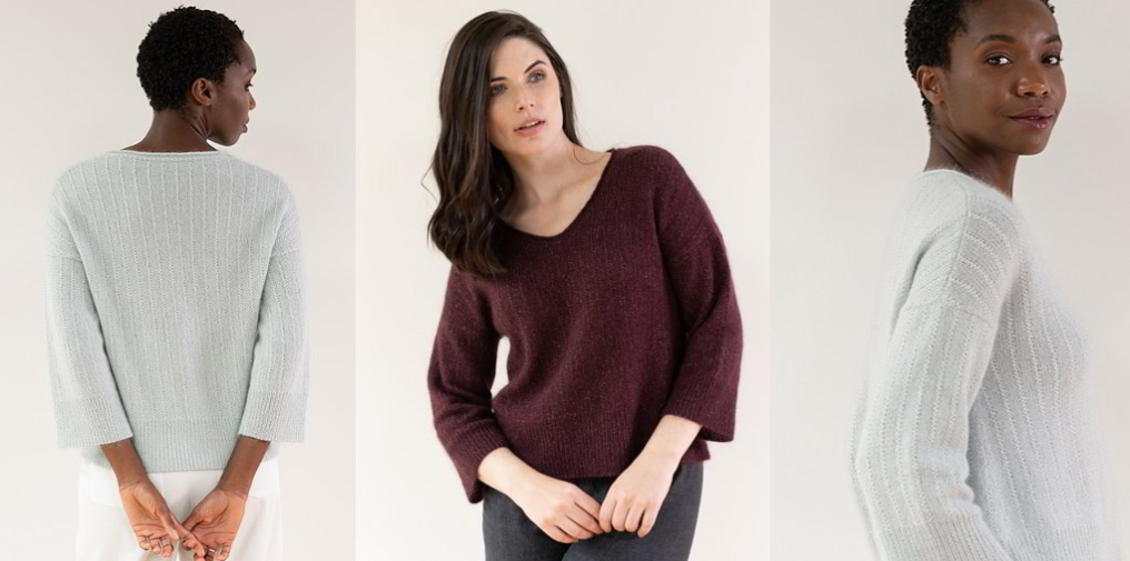 Стильный и роскошный женский пуловер свободного силуэта с V образным вырезом вязаный спицами простым узором.