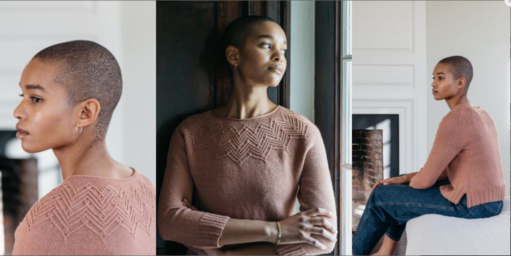 Кокетка пуловера вяжется по кругу узором Сашиком, по мотивам одной из популярных японских вышивальных техник. Планки пуловера связаны изящной граненой резинкой.