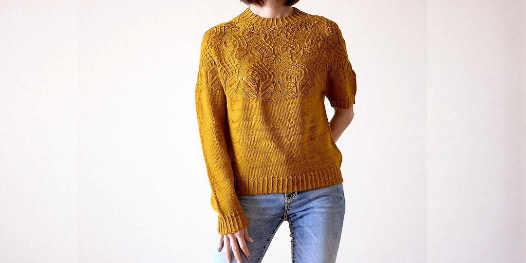 Yurinoki (или Тюльпанное дерево) – свободный пуловер с круглой кокеткой, которую украшает, как ожерелье, невероятно красивый цветочный узор.