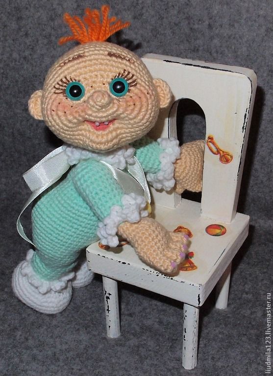 Ручки и голова крепятся в процессе вязания с помощью пластиковых суставов (шплинтов), поэтому подвижны. Глаза винтовые, реснички, бровки, ногти прорисованы.