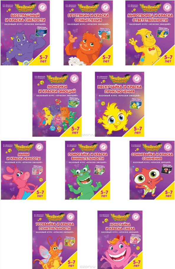 Книга 4 Монсики и Краски Эмоций. (Автор: Шиманская В.А., Огородник О.Я.) Рабочая тетрадь 'Монсики и краски Эмоций' является вводным пособием курса 'Краски Эмоций', который знакомит детей с базовыми эмоциями, а также с ключевыми понятиями, необходимыми для социализации и самоорганизации. Выполняя интересные задания тетради, дети познакомятся с картой Долины Монсиков и узнают, где находятся Лес Страха, Горы Достижений, Болота Лени, Город Счастья и другие сказочные места. А Компас Эмоций покажет, как зовут каждого Монсика, чем он занимается, за какие эмоции и чувства он отвечает. Задания тетради 'Монсики и краски Эмоций' представляют собой увлекательный квест-приключение и направлены на развитие внимания, наблюдательности, мелкой моторики рук и навыков письма, логического мышления и простых навыков коммуникации.