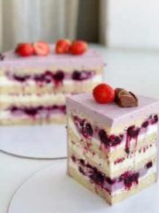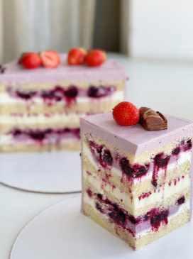 Торт 'Ягодный пломбир': нежный ванильный бисквит с чёрной смородиной, пропитка, ягодное конфи, ягодная намелака, сырный крем и мусс на белом шоколаде.