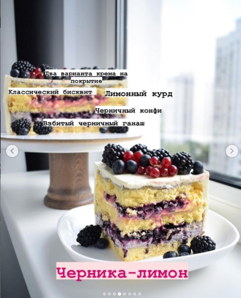 Ванильныи? бисквит с взбитым черничным ганашем на белом шоколаде, черничным конфи и лимонным курдом.