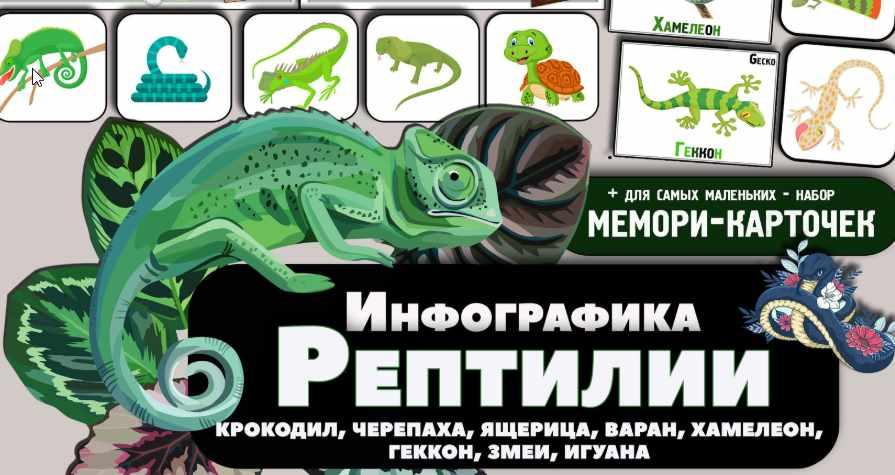 9 страниц инфографики: крокодил, ящерица, черепаха, игуана, хамелеон, змеи, и другие;