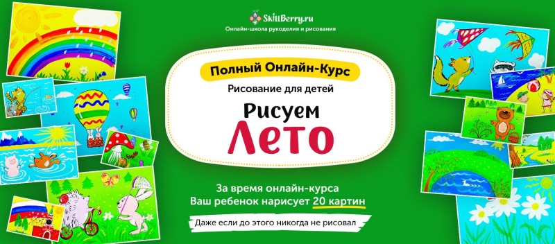 За время онлайн-курса Ваш ребенок нарисует 20 картин фломастерами, гуашью и восковыми мелками.