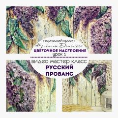 • Фоном для сирени в данной работе служит панно с имитацией старого забора. Вы узнаете очень интересный способ создания сколов и трещин для имитации ветхой поверхности. И конечно же сможете применять его для стилизованного оформления предметов интерьера, мебели, создания фотофонов и других работ.