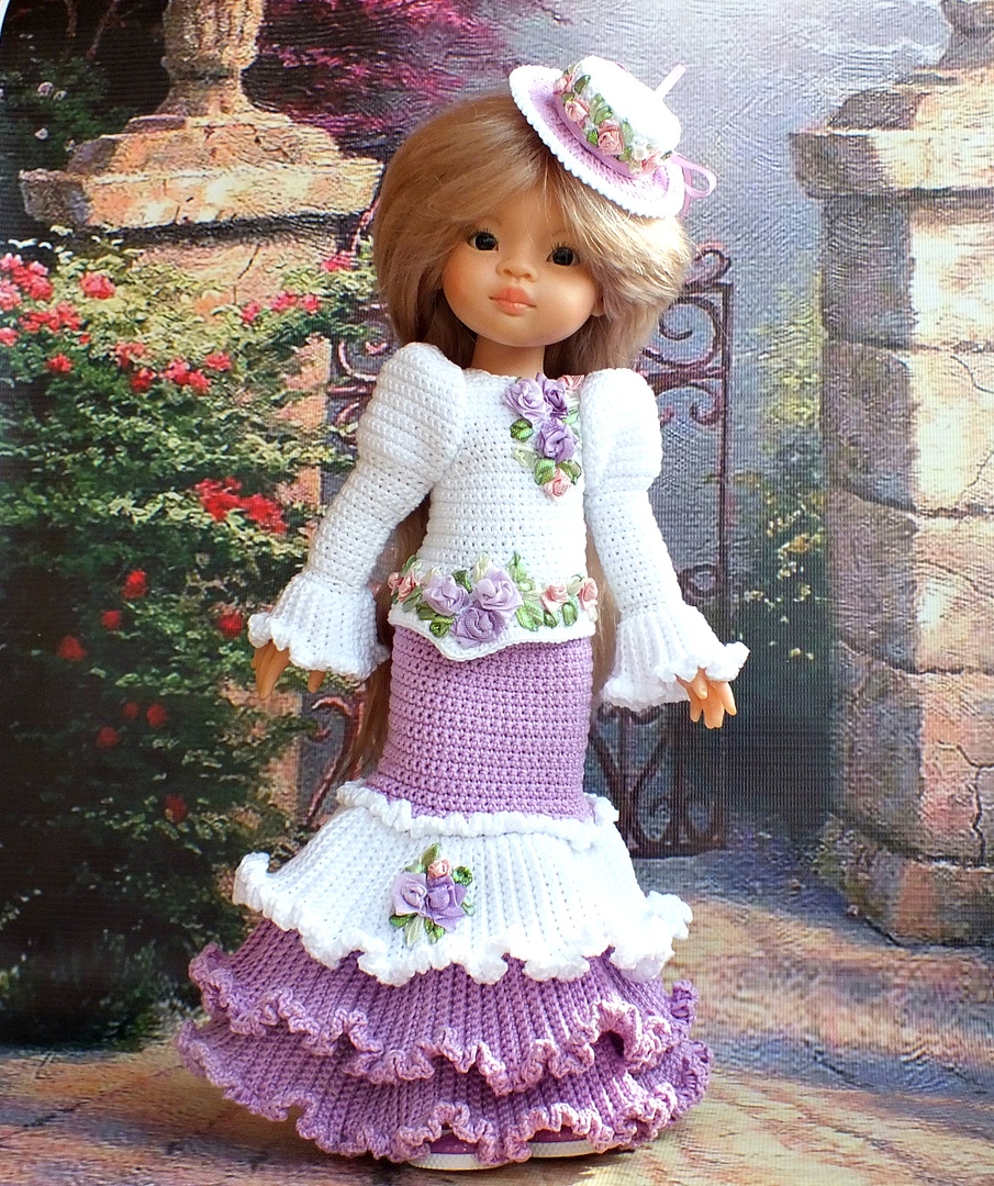 Комплект одежды (юбка, блуза, шляпка). Связано крючком. Украшено вышивкой лентами