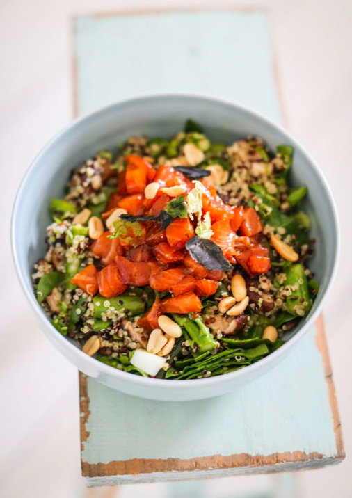 • Салат с креветками и манго, с заправкой из авокадо и спирулины