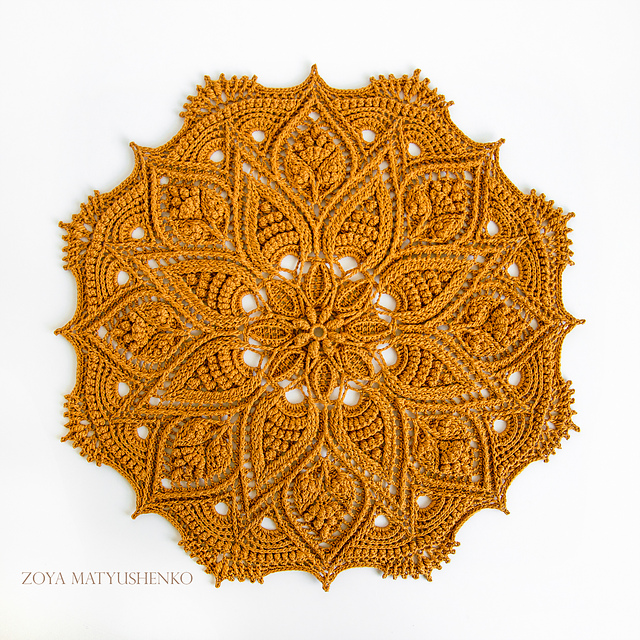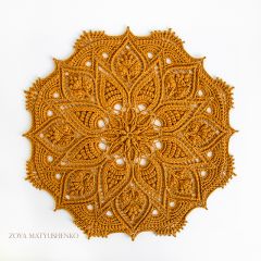 Расход нити, размер крючка, размер готового изделия будет зависеть от Вашей плотности вязания. При использовании рекомендуемых материалов, на эту схему уходит около 500-550 м нити, и размер готового изделия выходит около 34 см в диаметре по крайним пико.