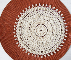 Расход нити, размер крючка, размер готового изделия будет зависеть от Вашей плотности вязания. При использовании рекомендуемых материалов, на эту схему уходит около 260-280м нити, и размер готового изделия выходит около 28 см в диаметре по крайним пико.