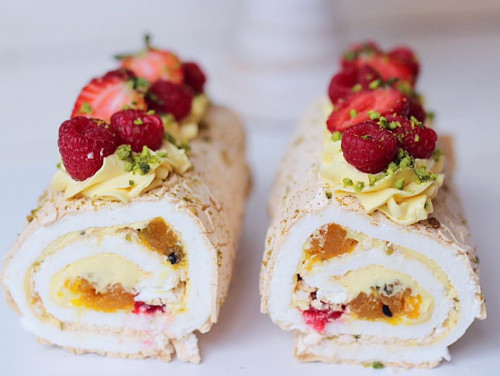 4. Меренговый рулет с начинкой манго-маракуйя и свежей малиной,