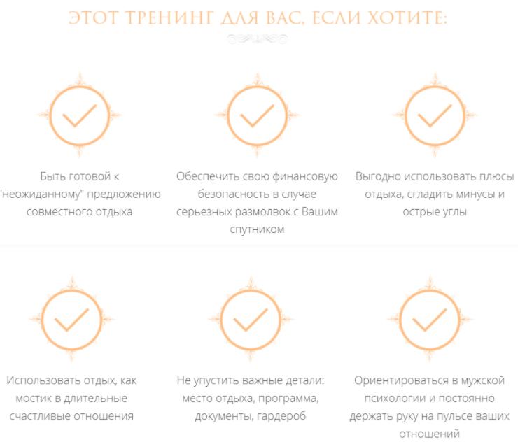 Я подготовила максимально подробные уроки. В них разобраны самые распространенные щекотливые ситуации, в которых Вы можете оказаться на отдыхе. Все мои тренинги построены на глубоком знании мужской психологии, особенностей и предпочтений успешных мужчин. Я изучала их более 15 лет. Не нужно бояться мужчину. Просто нужно уметь грамотно управлять отношениями с ним, сделать так, чтобы он понял – с Вами ему лучше, чем без Вас.
