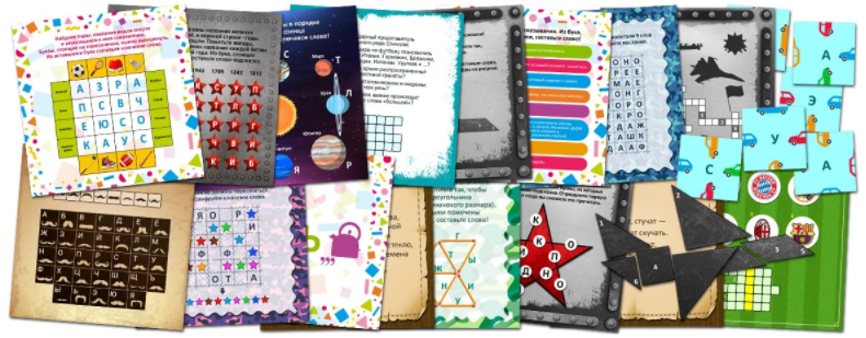 Каждое задание представлено в нескольких вариантах (с разными ответами). Это дает возможность провести квест в любом доме или квартире, а также организовать командные соревнования, создав две параллельные квест-цепочки.