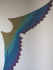 На эту шаль необходимо 731 метр тонкой пряжи. Показанный на фото образец был связан из 1 мотка Blue Brick Manitoulin Merino Sparkle Wooly Mammoth в цвете Ibis, входящем в коллекцию Aviary (731 м, 200 гр).