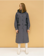 Выкройка плаща-дождевика. Плащ-дождевик свободного объема, прямого силуэта длиной ниже линии колен, без подкладки. Перед с центральной бортовой застежкой на кнопки. На деталях переда по два прорезных кармана на молнии верхний расположен вертикально, нижний горизонтально. Спинка с горизонтальной кокеткой и средним швом, по боковым швам имеются разрезы. Рукав рубашечный, низ обработан притачной манжетой с патой и кнопками для регулирования объема, по линии притачивания манжеты заложены две односторонние складки. Капюшон втачан в горловину вместе с воротником-стойкой. Капюшон умеренного объема, с отрезной центральной частью, в переднем срезе капюшона обработана кулиска с плавной регулировкой прилегания при помощи круглого шнура. Для фиксации шнура установлены по две люверсы справа и слева и стопоры с двумя отверстиями.