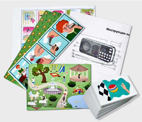 Карта памяти, на которую записаны 60 неречевых звуков из первого набора и 74 неречевых звука из набора «Слушать интересно 2», 50 карточек с иллюстрациями к звукам (музыкальные инструменты, музыкальные игрушки, дикие и домашние птицы, транспорт, животные), 2 больших сюжетных картинки с иллюстрациями к звукам: «вечер в парке», «субботний день дома», (на больших сюжетных картинках присутствуют как новые звуки, так и звуки, встречающиеся на отдельных карточках), 4 карточки с заданием на определение последовательности звучания.