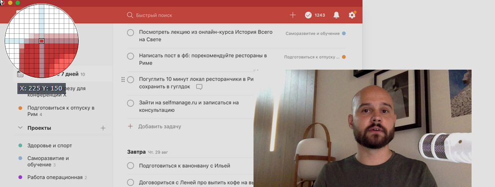 Демонстрация деления по принципу области-проекты-задачи, цветовая индикация проектов и областей, разница между задачами и проектами