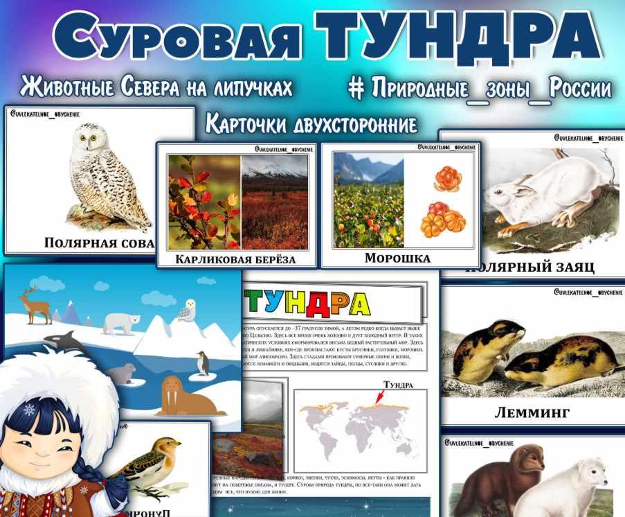 • двухсторонние карточки растительного и животного мира: северный олень, песец, полярный заяц, лемминг, полярная сова и тд.