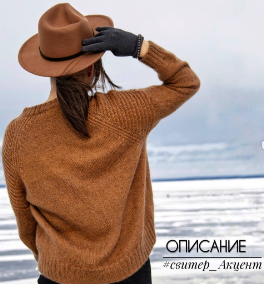 Свитер вяжется по кругу (без швов) снизу вверх до проймы. Далее детали разделяются на перед и спинку, которые вяжутся по очереди поворотными рядами до скосов плеча.