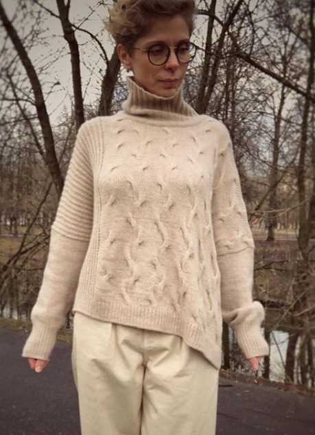 Cвитер связан в одном размере с большим запасом свободного облегания . Ширина тела 68см. Связан из пряжи biagioli modesto 100% кашемир 350м/100гр . Потребуется 450гр. Свитер имеет асимметричный нижний край. Но может быть и прямым. Это регулируется плотностью вязания . Основные спицы 4,0 . Свитер связан без швов. Сверху вниз. Плечевые швы смещены назад. Спущенное плечо . Горловина оформлена имитацией пришивной горловины .