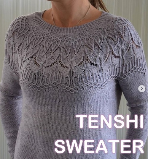 ТЕНШИ означает «ангел» на японском. Я решила дать это красивое имя свитеру, так как узор на круглой кокетке напоминает мне крылья ангелов, и кто из нас не хочет чувствовать себя в объятьях ангелов? Это бесшовный пуловер, который вяжется сверху вниз с интересным ажурным узором на кокетке и изнаночной гладью на теле и рукавах (вяжется лицевой гладью с изнаночной стороны). Свобода облегания составляет 6 – 10 см в зависимости от выбранного размера. На фото представлен размер 2 со свободой облегания 6 см.