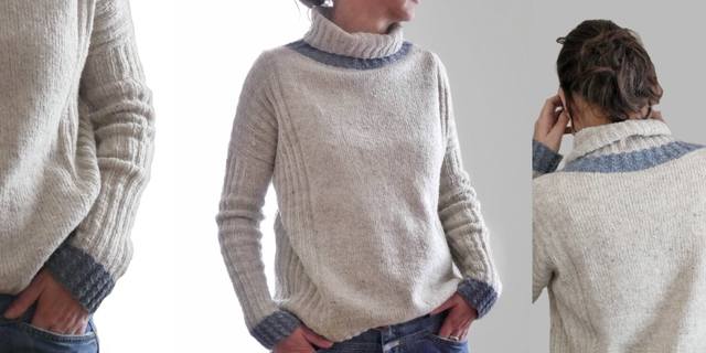 Свитер из двух цветов пряжи, связанный спицами от горловины круговыми рядами.