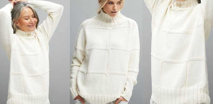 Отличный свитер разработан компанией Texyarns, сам цвет свитера уже несет элемент торжественности, а несложный узор простой лицевой гладью и небольшими переплетениями петель в углах квадратов, очерченных изнаночными петлями быстро вяжется и эффектно выглядит.