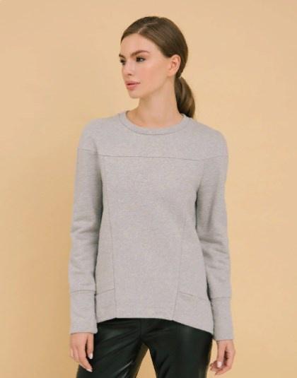 Свитшот свободного объема. На переде диагональные рельефы. Боковой шов отсутствует. На переде и спинке широкая кокетка, цельнокроенная с верхней частью рукава. Рукав покроя реглан, по низу оформлен широкой притачной манжетой. Линия низа плавно скошена: спинка длиннее переда. Низ свитшота оформлен планками, образующими на спинке фигурные выступы. Горловина обработана бейкой.