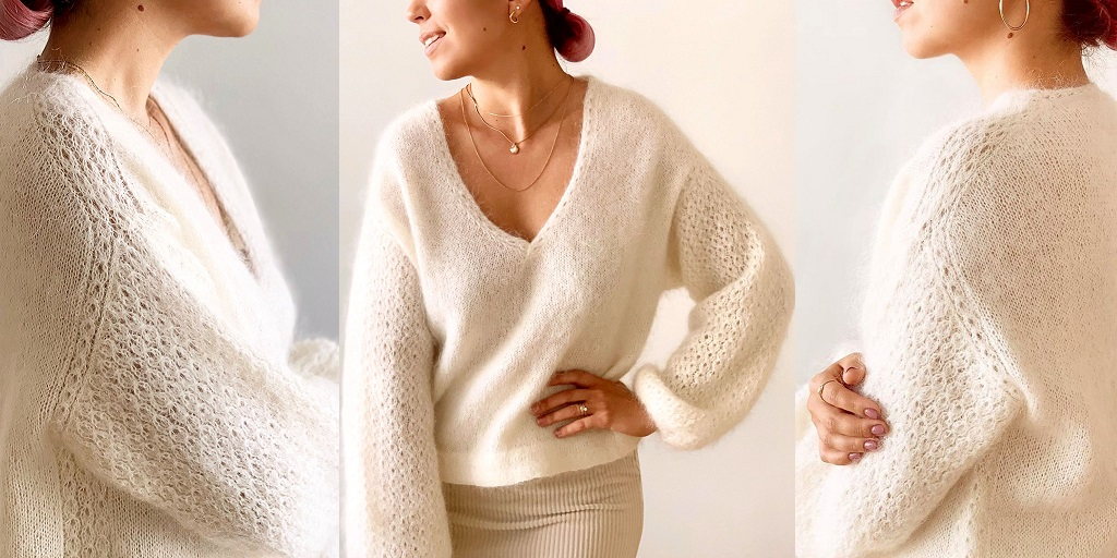 Женственный пуловер свободного силуэта с глубоким вырезом горловины и пышными рукавами связан из нежного мохера с шелком.