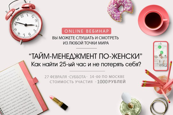 Вебинар подойдет не только для владельцев бизнеса, но и для всех, желающих узнать цену времени и как управлять СВОИМ временем. Распорядок дня, правильная постановка цели, расстановка приоритетов, краткосрочные и долгосрочные планы - это лишь малая часть того, что вы можете узнать. Примите участие в вебинаре, и вы получите не просто информацию, но и 'пинок' к действию. Ждем вас на онлайн-встрече!