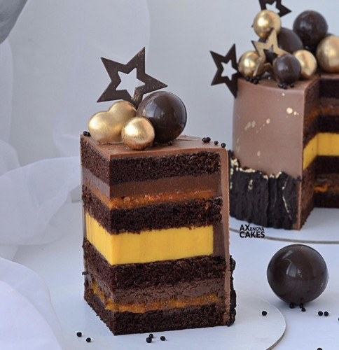 Тут шоколадно-сливочная начинка, нежнейшее кремю манго-маракуйя, ароматные сочные кули манго-маракуйя, насыщенный влажный бисквит на шоколаде.