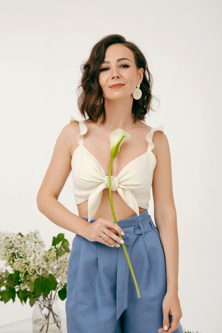 Кроп-топ на бретелях. Топ завязывается на широкие завязки спереди. Бретели оформлены воланами. Топ полностью двойной, все швы закрыты.