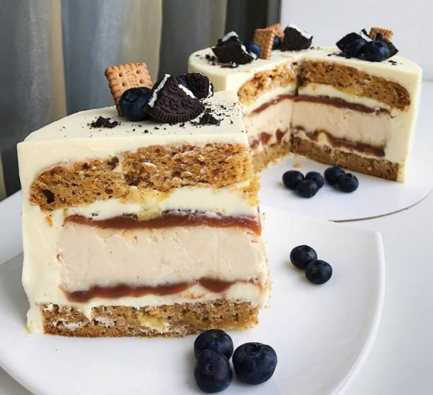 Морковные коржи, карамель, карамельный чизкейк и крем-чиз с белым шоколадом.