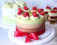 Торт Три Шоколада с фисташкой: новый брауни, более нежный и идеально гармонирующий с хрустящим слоем фисташка-шоколад, мусс тёмный шоколад , мусс молочный шоколад, мусс фисташка-матча , фисташковая глазурь (не желе), украшение.