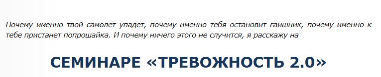 Человек покупает у нас материал по вебинару. Материал высылается файлом, отправка занимает минуты, дольше идет транзакция. Но через 10 дней человек перезванивает и сообщает, что не получил материал. При этом он смущен, он с трудом формулирует мысль, ему тяжело дается общение по телефону. Он ждал 10 дней, чтобы уточнить, выслали ли ему на элекронку файл. И 10 дней его съедала тревога перед общением с нашим консультантом. Это пример тревожности, о которой пойдет речь на семинаре «Тревожность 2.0»